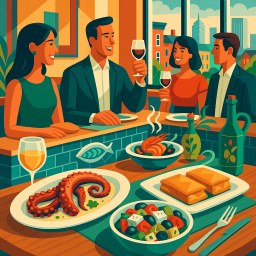 Like a taverna on one of the numerous islands in the Aegean Sea. Upscale without attitude. Happy Hour at the bar is packed. Every appetizer we shared was enough to whet the palate. Dining tables are close together so it's easy to converse with